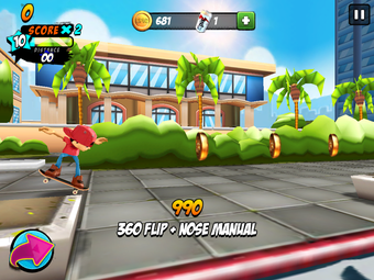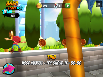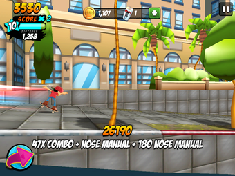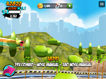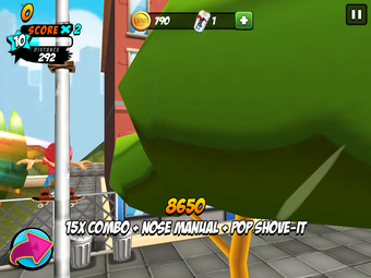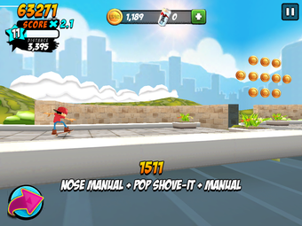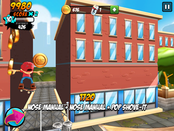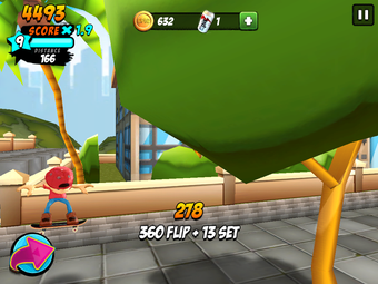 Los trucos avanzados son más difíciles de lograr; normalmente requieren deslizar dos dedos o mantener un dedo en el botón de giro, que se encuentra en la parte izquierda de la pantalla. Al final, en la mayor parte de juego, te verás evitando movimientos complicados y quedándote con los básicos, con ollies y kickflips, uniendo los trucos para conseguir movimientos como el manual, que se puede hacer fácilmente deslizando hacia adelante.