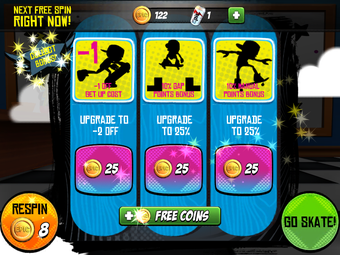 No hay muchas opciones para personalizar el personaje o la tabla, pero puedes evolucionar en varias categorías como ollie, spin y manual, utilizando las monedas doradas que están conectadas a lo largo de la pantalla.